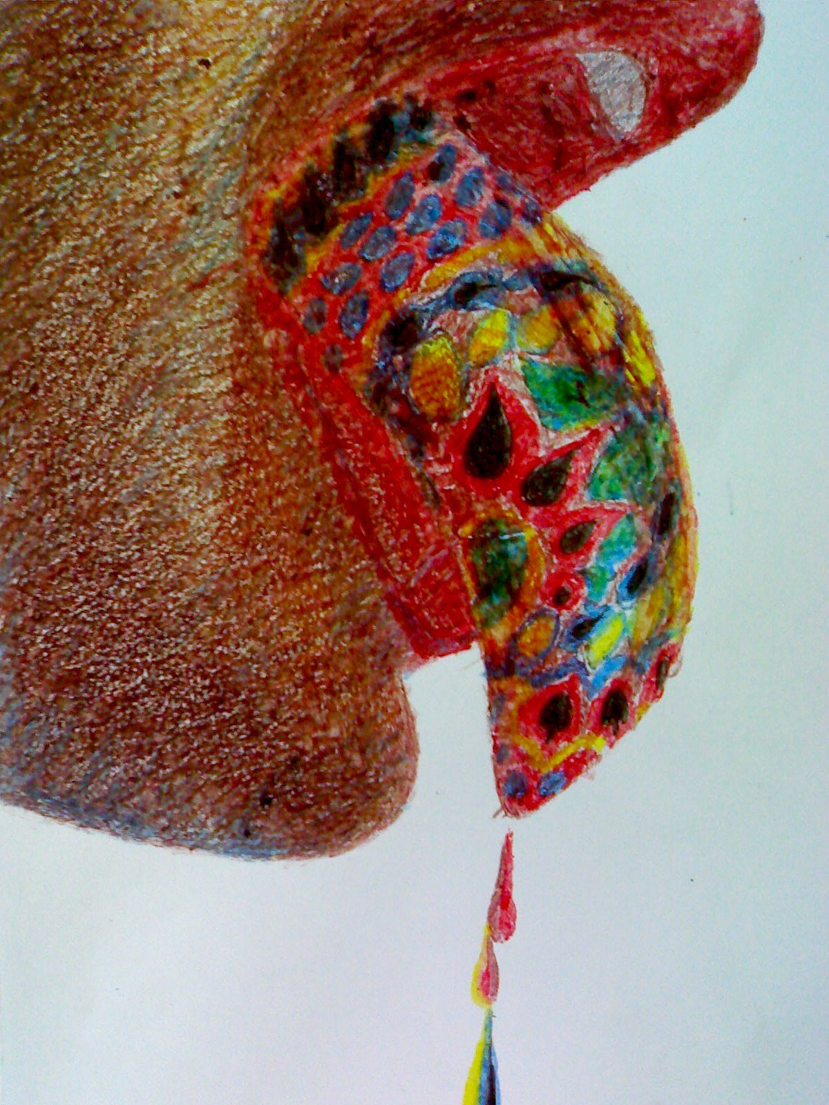The artist is dressed in a multicolored tailor – made uniform that covers entirely his body.